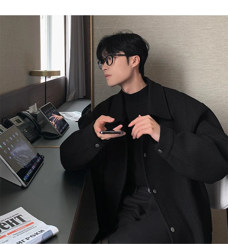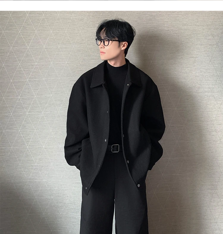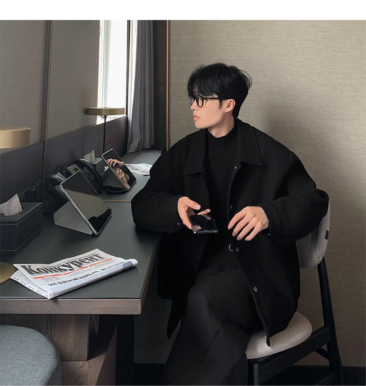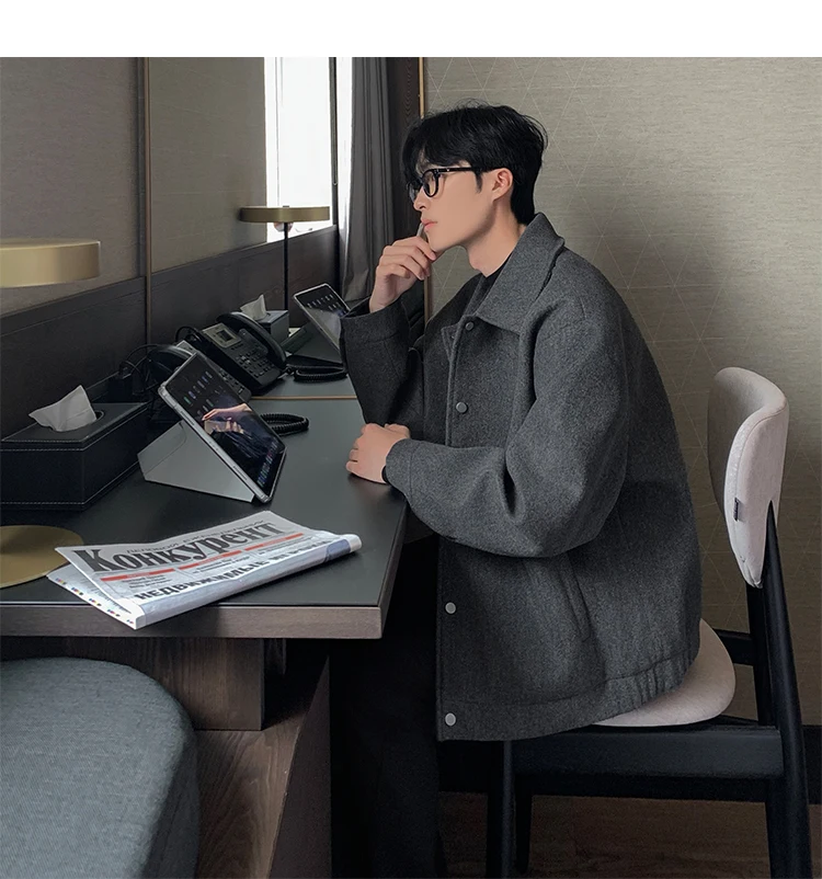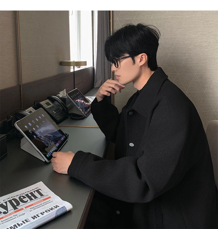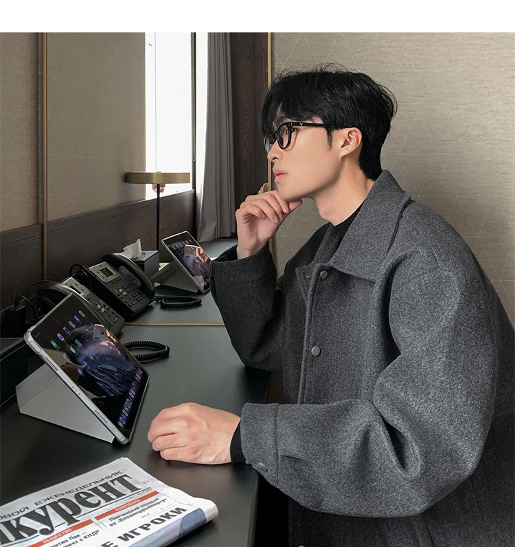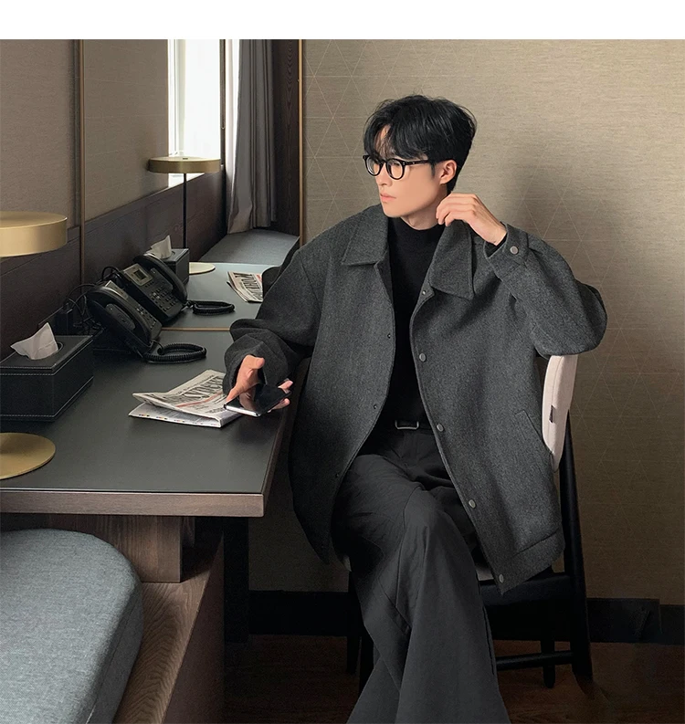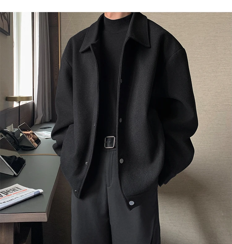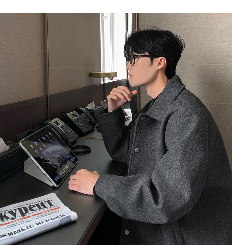 Este casaco de lã apresenta um design de dupla camada, proporcionando um visual elegante e moderno, perfeito para o outono e inverno.